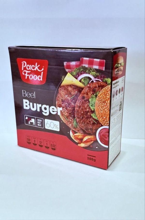 همبرگر پک فود از گوشت قرمز چرخشده (۶۰٪)، نشاسته خوراکی، روغن گیاهی، نمک، فلفل، سیر، شیر خشک، تخممرغ، گلوتن، کازئینات سدیم، فسفات سدیم، اسید آسکوربیک و نیتریت سدیم تهیه شده و در بستهبندیهای سلوفان یا وکیومشده با وزنهای مختلف عرضه میشود. این محصول نیمهآماده و منجمد است و تنها با چند دقیقه سرخکردن یا گریل قابل مصرف میباشد.